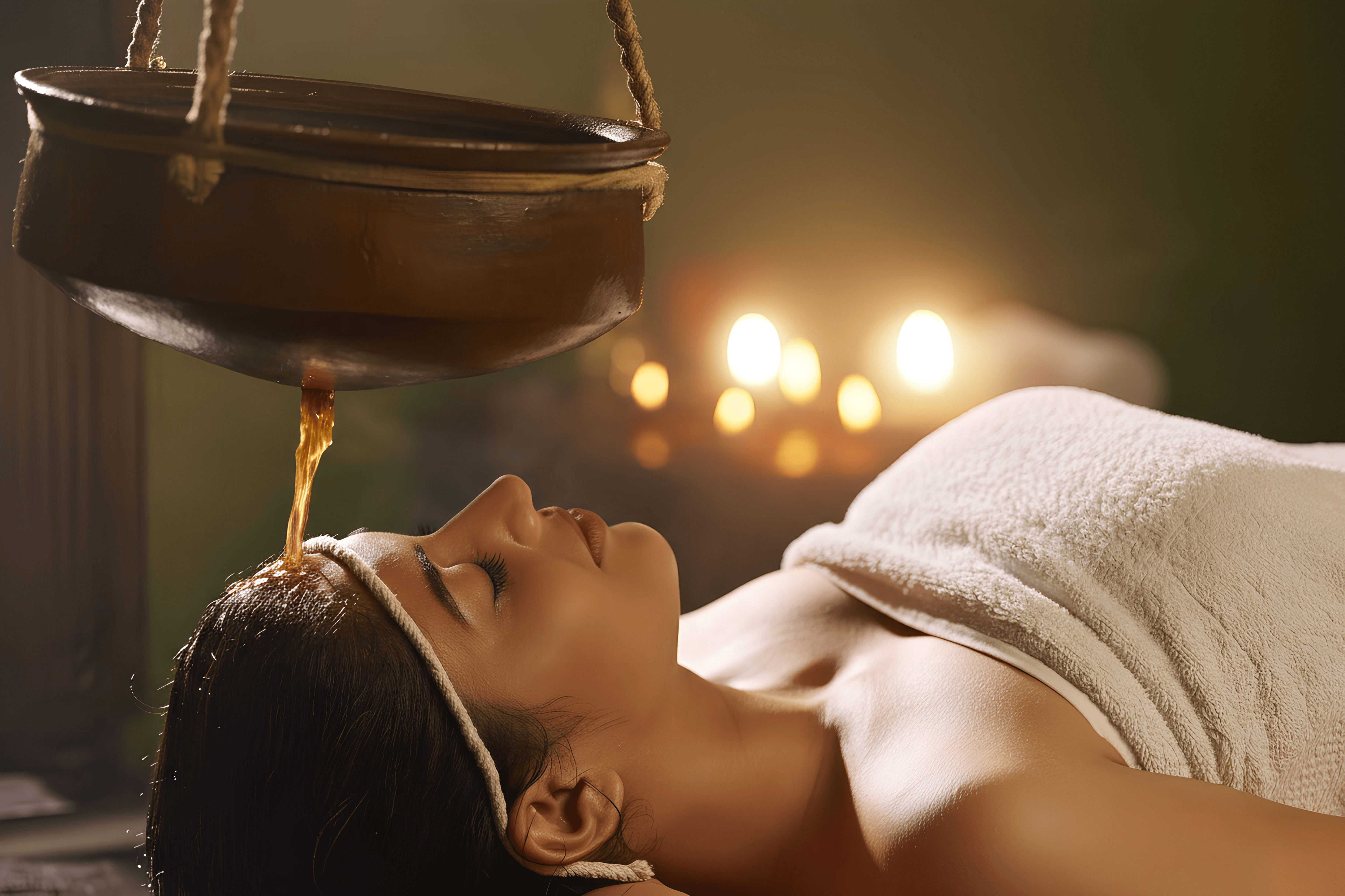 Shirodhara involves a continuous, soothing stream of warm oil poured onto the forehead to calm the mind and nervous system. It may be preceded by a head massage but doesn’t necessarily require a full-body ritual beforehand